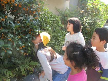 3時間目の生活では,あきみつけをしにみんなで月読神社まで歩きました。道には金木犀のきれいな花が咲いていてとてもいい匂いがしていたり,柿が木にたくさん実っていたり,歩きながらいろんな秋を見つけました。これからもっといろんな秋が見つかるといいですね♪