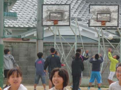 高学年は、グランドの端にあるバスケットゴールを使って、バスケをしています。