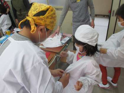 6年生は1年生に給食の準備の仕方を教えました。エプロンの着方,手の洗い方,配ぜんの仕方など,やさしく手を取りながら教えていました。6年生は自分の給食を早く食べ終わると,片づけまで積極的に手伝っていました。リーダーとして頑張っています。