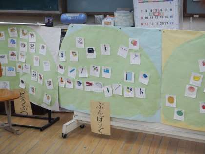 絵カードを見て,動物や果物などいろいろな仲間に分けていきました。