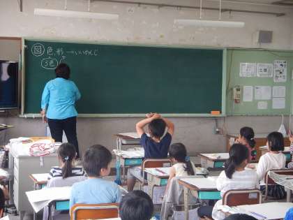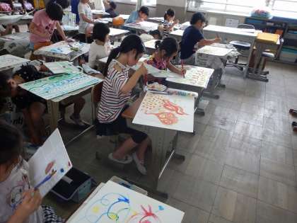 絵の具で自分の好きな色を3色選び,いろいろな形を画用紙の上に描いていきます。色と形がいい感じにマッチするよう,工夫し悩みながら頑張っていました。