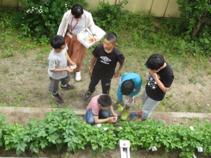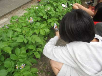 理科では植物の成長に必要なものを調べるために実験をします。今日はその準備としてジャガイモの葉にアルミホイルをかぶせました。でんぷんは葉にできるのでしょうか。
