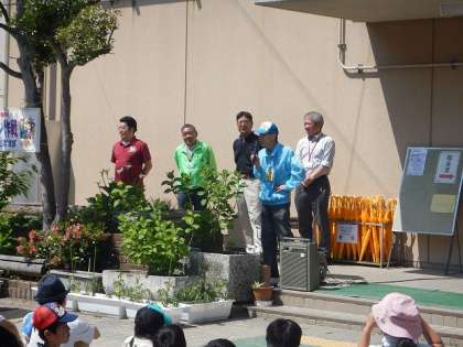 小学生と松尾中学校の中学生,地域の方と協力してゴミ拾いをするクリーン作戦です。はじめにみんなで集まってお話を聞いたり,注意事項を確認したりしました。そして,松尾の街をきれいにしようとやる気いっぱいで出発です。