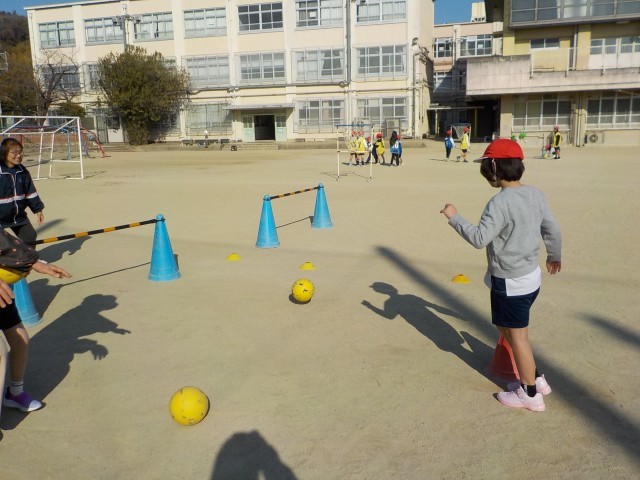 体育科では、ボールけりに取り組んでいます。今日は、ゴールに向かってシュートする練習に取り組みました。ボールをよく見て狙いを定める子どもたち。シュートして「やったー!」と喜ぶ姿が見られました。遠いところからドリブルをしてシュートをする人も。練習するたびに上達してきています。