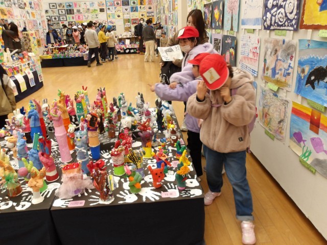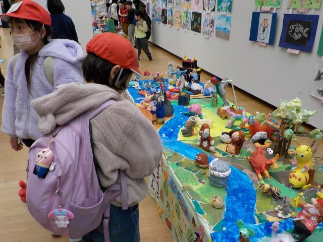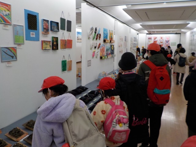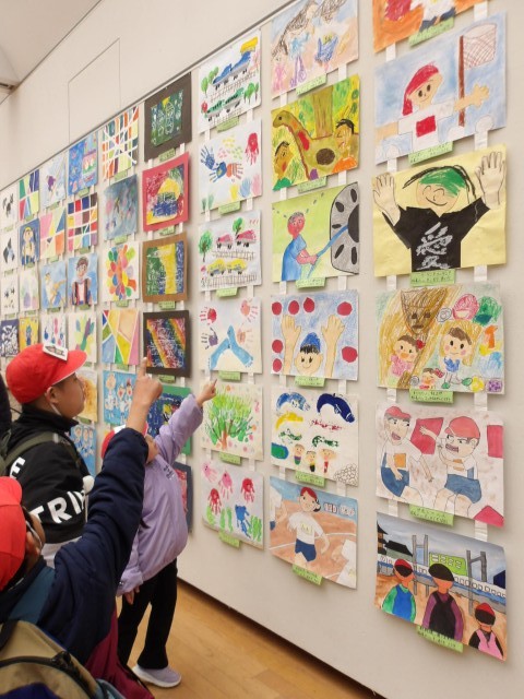 館内はたくさんの人で、じっくりとは見づらかったですが「あ、私の絵!」「こんな風にピースが並んだんやね。」「~小学校の作品も素敵やな!」「中学生になったら、あんな作品をつくってみたいなあ。」と、見た作品に対し、いろいろなことを言っている6くみの仲間たちでした。