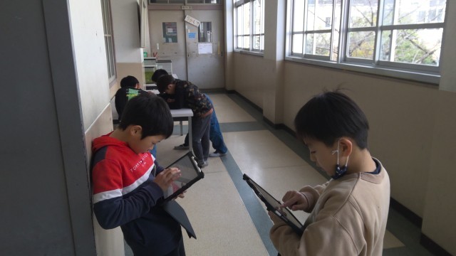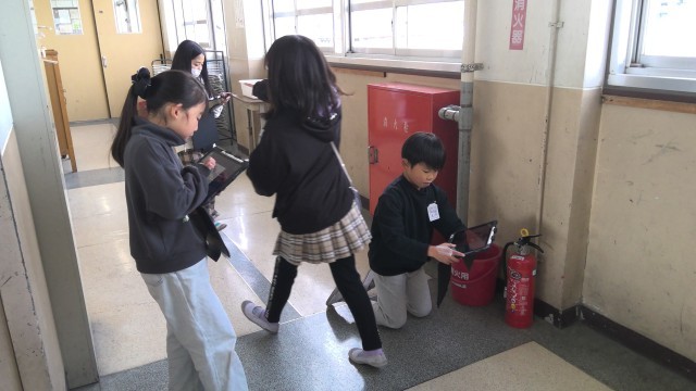 今日は、学校の中には火事をふせぐためにどんなものがあるのかをグループに分かれて調べました。