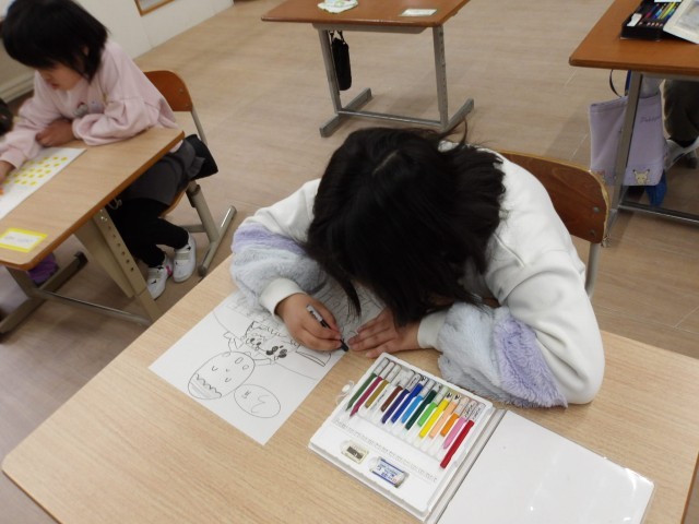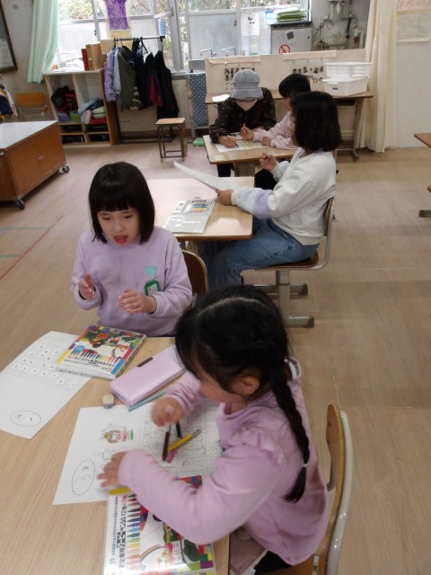 「3月と言えば、お雛様!!」と言って、お雛様を描く人もいれば、「明日は年に1度の三色ゼリーや!」と言って、三色ゼリーを描く人もいました。また、カレンダーを制作しながら「あと、何日で卒業式や・・。」と言う人もいました。