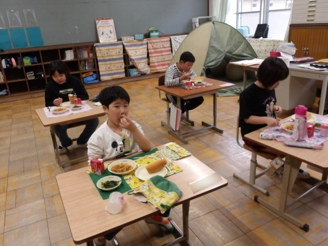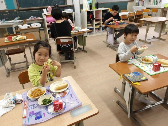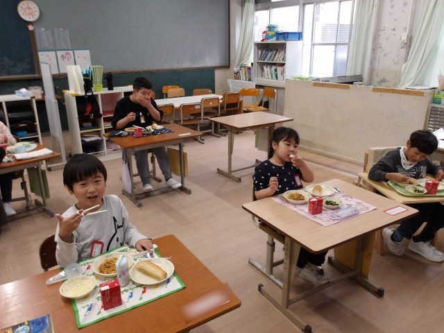 「小学校の給食、お~いし~!」と言う1年生も「小学校最後の給食が始まったなあ。」と、しみじみ感じている6年生も・・・12人みんな、おいしく給食をいただきました。