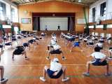 今日は運動場での練習です。運動場で立ち位置を確かめたり移動をしたり,みんな一生懸...