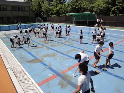 梅雨の晴れ間の今日,6年生がプールの掃除をしてくれました。まず,プールサイドにあった大量の落ち葉を集めてきれいにし,その後,デッキブラシやたわしでプールの壁・底の汚れをこすって落としました。来週から水泳学習が始まります。きれいなプールで気持ちよく泳げそうですね。