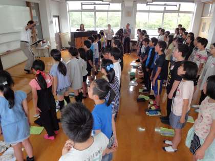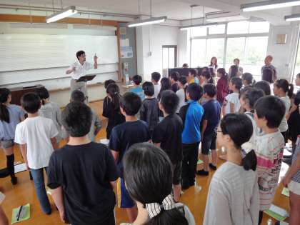 3時間目は6年生。6年生は,今,夏に行われるNHK合唱コンクール京都府大会で歌う曲の練習に取り組んでいます。今日は,課題曲「いまだよ」を服部先生に聴いていただき,小林先生と一緒に歌唱指導をしていただきました。