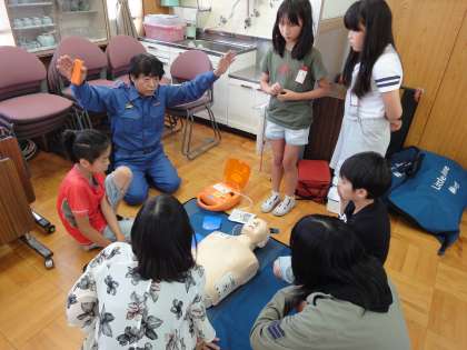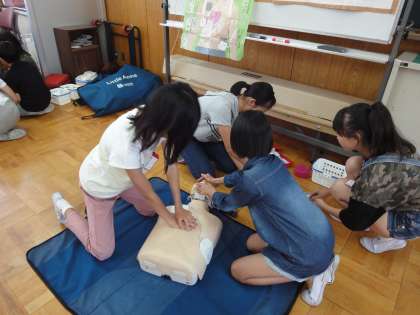 呼吸や心臓が止まっていた場合,何もしないでいると,その人の命は急速に失われていきます。そこで,救急事故を防ぎ,お互いが協力し合って大切な命を守るためにどうしたらよいか,救命処置や緊急時の対処方法を教えていただきました。