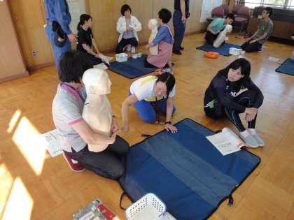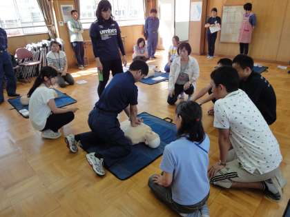 放課後には,教職員も救命講習を受講しました。安全・反応の確認,呼吸の確認の後,心肺蘇生法(胸骨圧迫,気道確保と人工呼吸),AEDの操作をいった一連の行動を一人一人練習しました。また,食べ物や異物が,口やのどに詰まって呼吸ができなくなった状態を想定し,気道異物除去の方法も教えていただきました。
