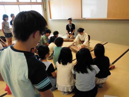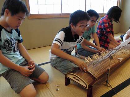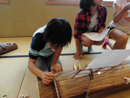 6年2組と一緒に琴教室に参加しました。琴の先生の演奏を聴いた後,爪をはめて「さくら さくら」の演奏にチャレンジしました。