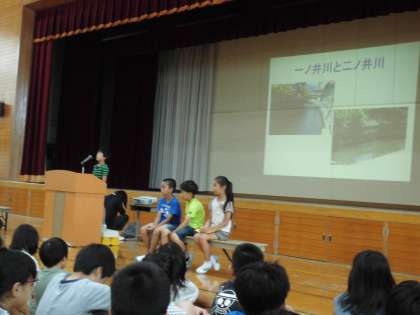 「どうしてお寺や神社は校区の西の山側にあるのか」とか「どうしてお店は北と南に分かれているのか」という疑問に答えたり,「校区を流れている川の水の量は晴れの日と雨の日で違う理由」や「一ノ井川と二ノ井川が北では一本の川なのに南に行くと二本に分かれている理由」について自分なりの考えを述べたりして,実践的な発表ができました。