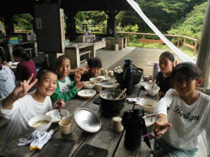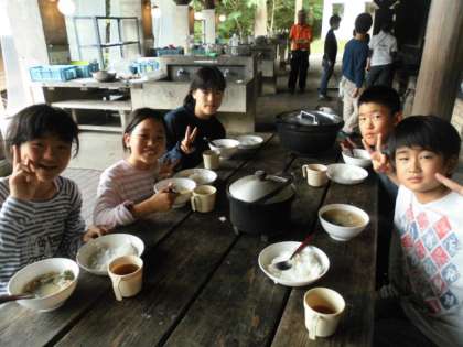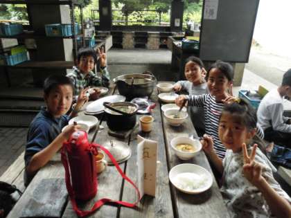 豚汁は昨日の反省で水を少し少なめにしたのはいいのですが,今度は味付けが濃くなりすぎたりして,グループによって味付けに差があったみたいです。料理を上手に作るには水加減がすごく大事だと感じました。でも,子ども達は自分たちで作った料理に大満足でした。