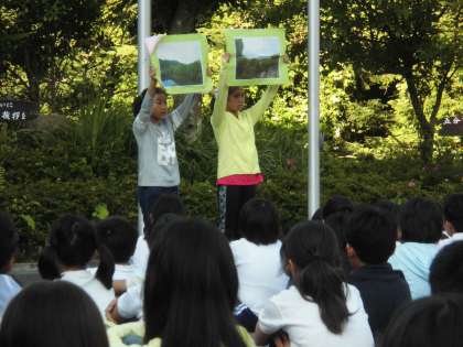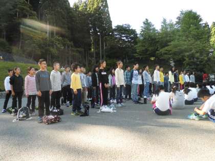 京都市内の大雨が嘘のように,山の家は今日もいいお天気です。「合同朝の集い」の学校紹介は実に見事なものでした。学校代表の二人はマイクを使わずに大きな声で発表できていたし,歌もきれいな声を響かせていました。きっと他の小学校のお友達の心にも気持ちが届いたと思います。朝食をすませたら,いよいよ「天狗杉登山」の出発です。今日のめあては「挑戦」。最後までくじけずに頑張りたいと思います。