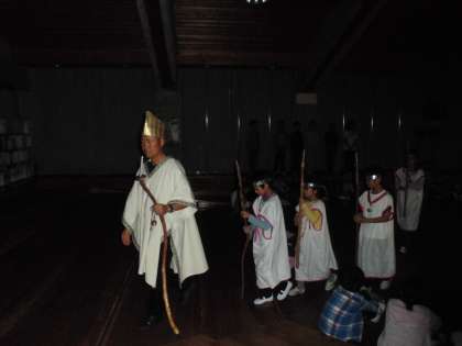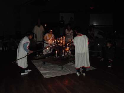 山の天気は移りやすいもの。先ほどまでいい天気だったのが急転直下。夕食を食べ始める頃から激しい雷雨となりました。したがってキャンプファイヤーの予定を変更して本館でキャンドルファイヤーをすることになりました。初めに火の神が火の子を連れて登場。知恵・優しさ・勇気・友情の火を分け与えてくれました。
