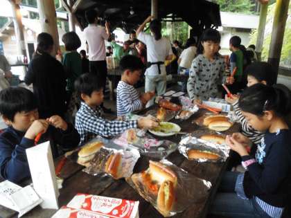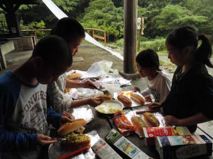 いよいよ山の家も最終日。今日のテーマは感謝です。朝食は第一炊飯場でパックドッグを作ります。まず初めにパンにキャベツやソーセージをはさみこみ,アルミホイルでまいていきます。