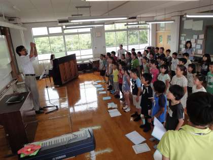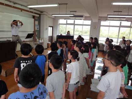 ミニコンサートの後に,4年生が「未来見つめて」という曲を歌いました。一人一人がしっかりと声を出し,きれいな声を響かせていました。途中で服部先生から歌っているときの姿勢やアドバイスをいただき,短時間で歌声が変わっていきました。