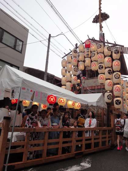 夜が更けてくると,鉾の提灯が灯ってとてもきれいでした。観光客が多くて蒸し暑い中ではありましたが,祇園祭の宵山の雰囲気を体感することができました。