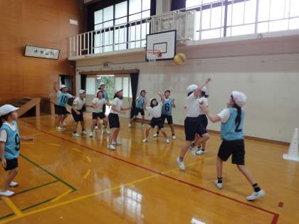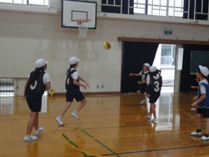 体育館では,3チームに分かれて,チームのメンバーにパスを次々と回していく練習をしていました。また,後半は,ゲームをしました。「パス,パス!」「ナイスシュート!」友達と声をかけ合いながら,ゴール目指して頑張っていました。