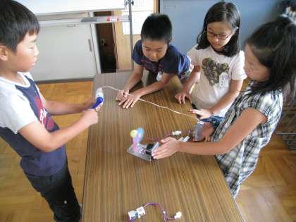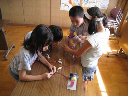 まず,電気についてお話を聞いた後,手回し発電機などを使って,電気を「作る」「貯める」「使う」実験を行いました。