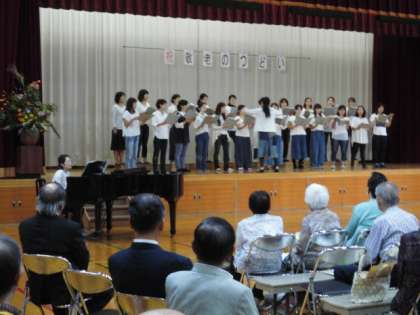 9月16日(土)自治連合会主催の敬老の集いが本校体育館で開催されました。ふれあいステージプログラムNO2.嵐山東小学校PTAのコーラス部が出場しました。「jupiter」と「見上げてごらん夜の星を」の曲を歌い,きれいなハーモニーを響かせていました。
