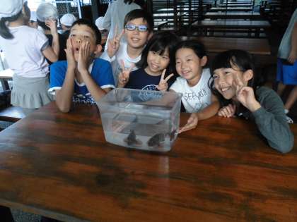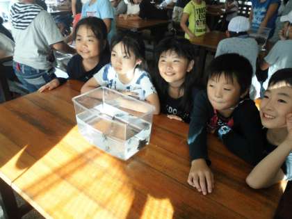 かごに入っていた魚は水槽に入れて,野外炊事場に持っていき,班ごとに記念写真を撮りました。