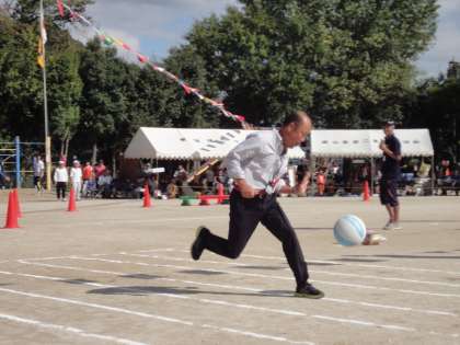 午後からのプログラム12.各種団体競技に,嵐山東小学校教職員チームが出場しました。ボールをドリブルしながら半周ずつ走り,4人でボールをつないでいきます。