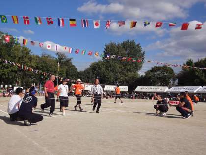 プログラム15.PTA競技「つながる つながる あらひがダッシュ」で,教職員がデモンストレーションをしました。ゴムひもを跳んだりくぐったりした後,折り紙のわっかをつなぎ,つるします。そして,段ボール積みをやってゴール!