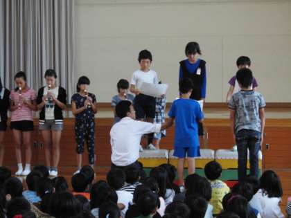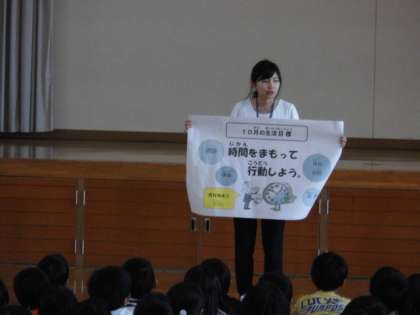 次に,運動委員会がドッジボール大会の表彰式をしてくれました。その後,10月の生活目標「時間を守って行動しよう」についてお話がありました。