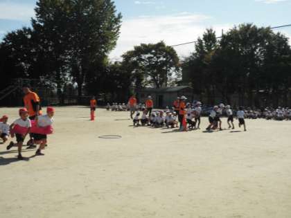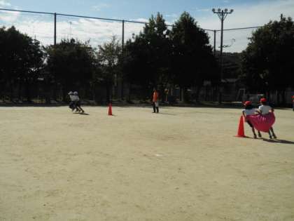デカスカリレーの練習では,教頭先生がミシンを使って新調してくださったデカパンをはいてゲームの練習をしました。