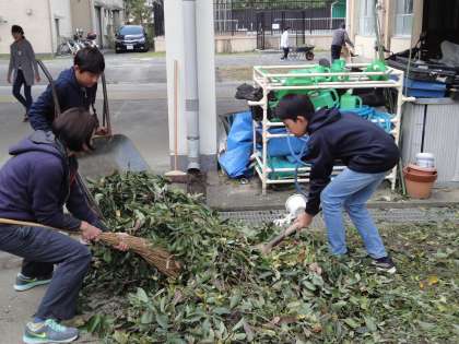 日曜日に近畿地方を通過した台風21号。今朝,登校してみると,木の小枝や葉っぱ,木の実がたくさん落ちていました。そこで,子どもたちが校庭や中庭,校舎周りを掃除してくれました。