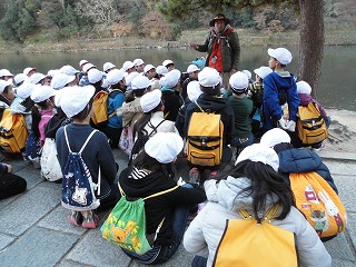 学校を出発して桂川を北上し,渡月橋を渡って小倉山に到着。そこで,小倉山の環境や植物の話を聞き,落ち葉掻きや間伐の必要性について考えました。