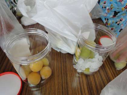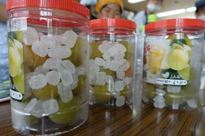 梅の解凍が始まると,ときどきビンを動かし,氷砂糖を溶かします。