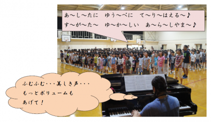 今学校では期間限定で,ミストシャワーを設置しています。休み時間に子どもたちが,そこを通って涼んでいる姿が見られます。今日の朝会では,子どもたちの美しい歌声に癒されました。しかし,まだのびしろがあります。今後のスキルアップを楽しみにしています。