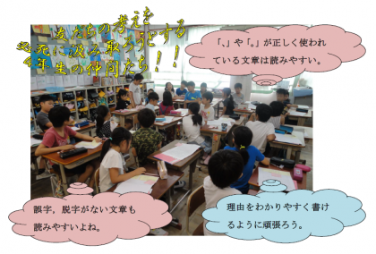 4年生国語科の授業の様子です。感想を伝え合っていました。自分の考えを書いて伝える際に,どんなことが大切なのかについて振り返っていました。