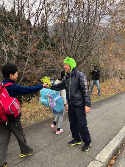 最後は花背山の家のマスコットキャラクター「ハナコロ」がお見送りしてくれました。その中には,再び「きーやん」の姿が!!