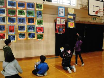 嵐山東ギャラリーには,西総合支援学校や京都朝鮮第二初級学校のお友達の作品も展示してあります。自分の兄弟の作品や家が近所の上級生の作品を探している子もいました。いいなと思ったところをたくさん見つけ,とても楽しそうに鑑賞していました。
