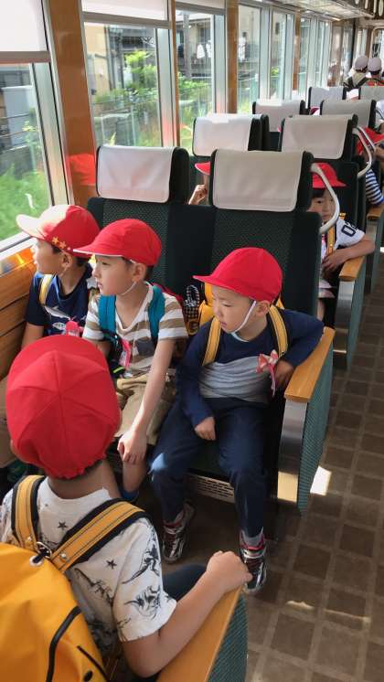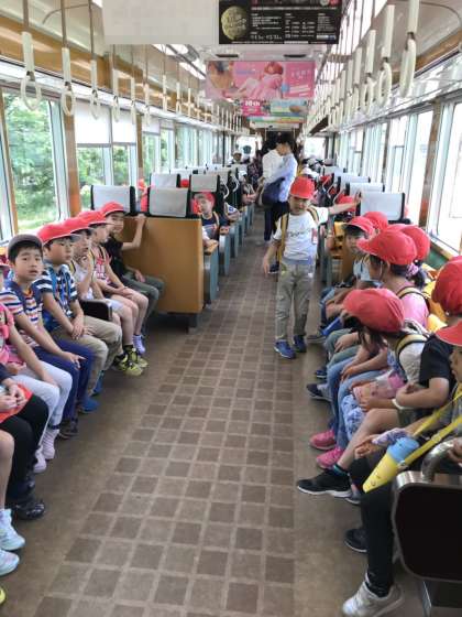 公共交通機関を利用し,宝ヶ池公園に向かっています。電車内のマナーを守ることも,大切な学習の一つです。