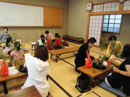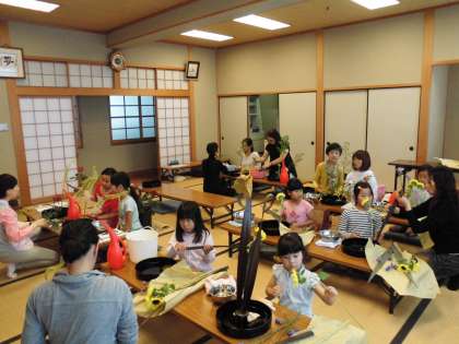 「 初夏の花をいける」平石 丹珠萠 先生と4人のスタッフの方々を講師に華道教室が開催されました。児童7名,大人4名の方々が参加をされました。