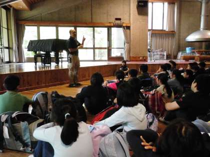 「花背山の家」に到着!その後,すぐに入所式をしました。入所式では,花背山の家の約束事を確認しました。