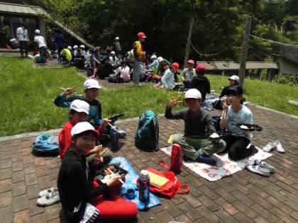 入所式を終え,宿泊棟に荷物を置き,お弁当タイム!グループごとに,からあげ弁当を食べました。