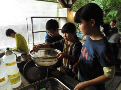 1日目の夕食は野外炊事『豚汁』です。班ごとに役割分担をし,調理開始。「ぼく,大根切るし,食器を洗っておいて。」「皮むきできたよ。次,何か手伝うことない?」など,友達と協力する姿がたくさん見られました。