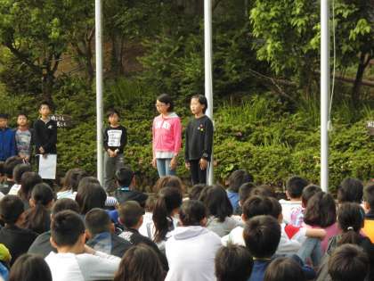 玄関前に,元気の良い朝のあいさつの声が響き渡りました。5校合同の朝の集いでは,各校の学校紹介を行いました。嵐山東小学校5年生は,学校紹介の後に,歌を歌いました♪二部合唱の歌声がとてもきれいでした。