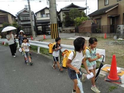 ブロックごとの話し合いが終わった後,運動場に集合し全体会をしました。登校時だけでなく,放課後の自転車の乗り方なども気をつけるよう,お話を聞いた後,集団下校をしました。みまもりネットの方やPTA地域委員さんと一緒に通学路の安全や「こども110ばんのいえ」を確認しながら,みんなで安全に下校しました。