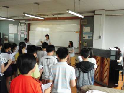 服部先生による特別授業は今年2回目。今日は『ブラックパンサー』という曲の指導をしていただきました。この曲は,歌うパートが途中で4部に分かれる部分もある難しい曲ですが,子どもたちはうまく歌えるようになりたくて,服部先生や小林先生が教えてくださることをメモしたり真似してみたりして,自分のものにしようとがんばっていました。