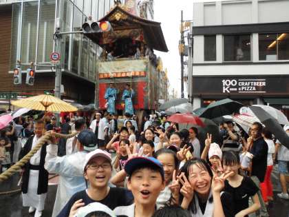途中から雨が降ってきましたが,観光客の方々と一緒に無事に曳き初めを行うことができました。立派な前懸・胴懸のインド・ペルシャ絨毯をはじめとした装飾品を間近で見るだけでなく,この祇園祭の山鉾を大切に後世に受け継いでいきたいという保存会の方々の思いにもふれることができました。