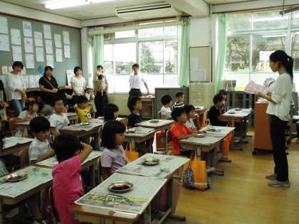 自分たちが育てたアサガオで,色水を作りました。その色水を和紙につけ,さまざまな模様を作り出しました。子ども達は,「アサガオの花の色はいろいろあるけれども,色水はみんな同じ色になって,すごい!」と驚いていました。